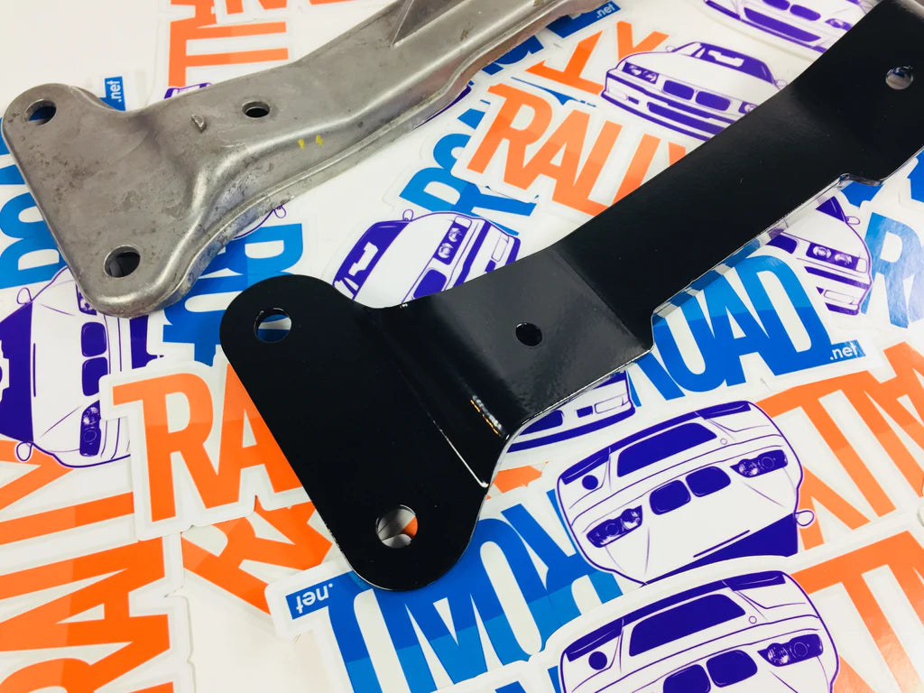 The part is black powder coated for good looks and rust protection. Laser cut, CNC Bent, TIG Welded for factory fit and high strength. It will work with all factory style transmission mounts (OEM, Vorshlag, UUC, etc)