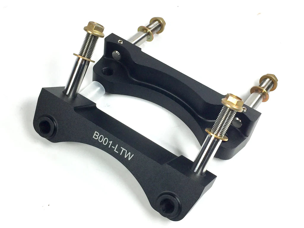 Brackets are made from 7075-T6 Aluminum and MIL spec black anodized for corrosion resistance. The studs are made from 17-4 PH pre-hardened stainless steel. Calipers are secured to the bracket/stud combo with supplied aircraft jet nuts and washers.